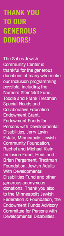 Please consider supporting the Sabes JCC and our Inclusion Programming. For more information contact Anita Lewis, Inclusion Director at [email protected] or 952.381.3489.
